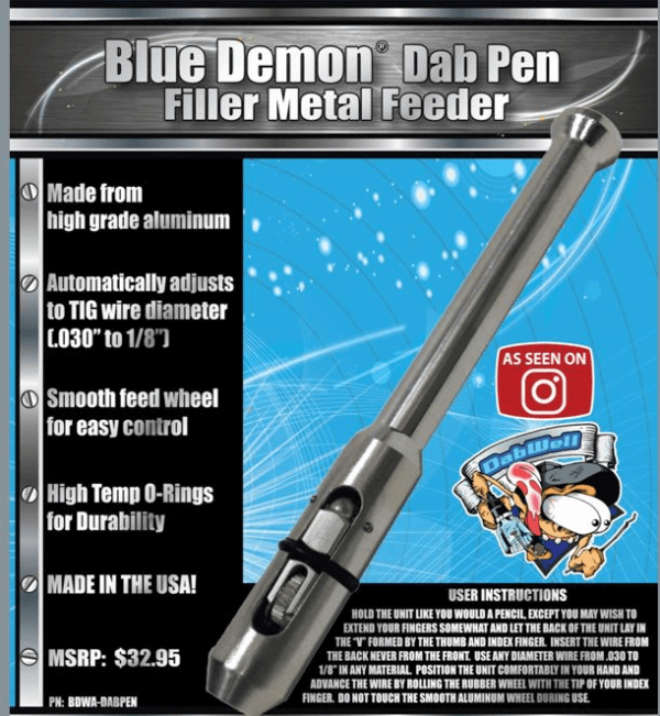 The Blue Demon Dab Pen is a tool that allows for more precise control of your filler metal when welding TIG. This pen is made from cast aluminum, sealed with durable high-temperature o-rings, and uses a toothed wheel to move your filler rod back and forth with your thumb, resulting in pinpoint precise control over your filler rod.