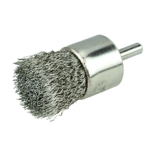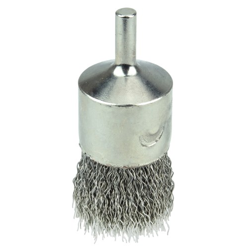 Weiler 1" Nickel-Plated Cup Crimped Wire End Brush features a solid end construction and very flexible brushing action. ideal for more demanding light-duty cleaning applications in corners and hard-to-reach areas. 1/4" stem diameter for use on die grinder and right angle die grinders.
