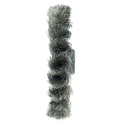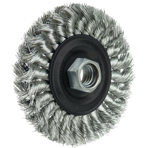 Weiler 4" Standard Twist Knot Wire Wheel Brush provides a heavy-duty brushing action with some flexibility for demanding deburring cleaning and surface preparation applications on somewhat irregular surfaces. 5/8"-11 nut for use on right angle grinders.