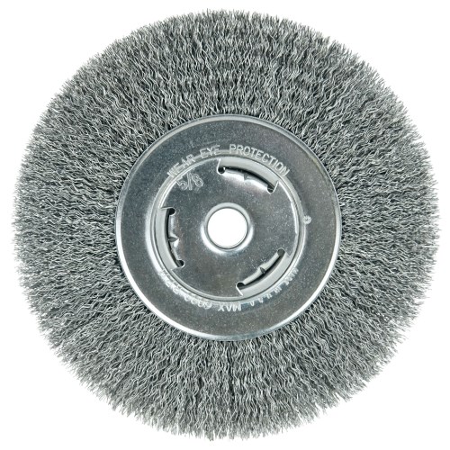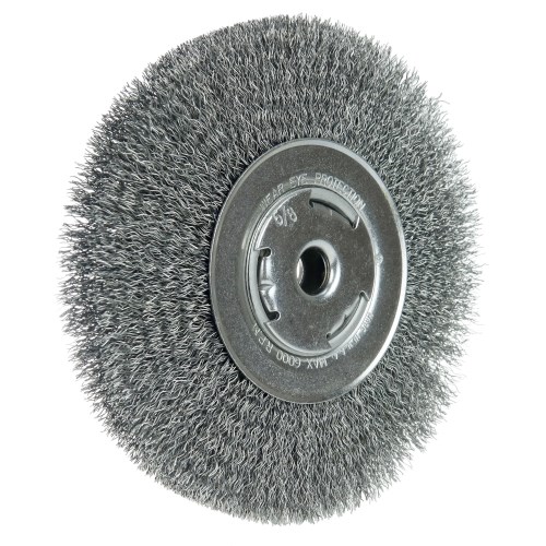 Wolverine 7" Wide Face Crimped Wire Bench Grinder Wheel provides a flexible brushing action and consistent performance for demanding light-duty cleaning and deburring applications on steel, armored steel, cast iron, ductile iron and tool steel parts. Features a wider face width to cover more surface area. 5/8"-1/2" arbor hole for use on CNC/milling/automatic machine, bench, pedestal and straight grinders.