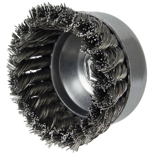 Weiler 4" Single Row Knot Wire Cup Brush provides heavy-duty brushing action with some flexibility for demanding cleaning applications on relatively flat surfaces. 5/8"-11 nut for use on right angle grinders.