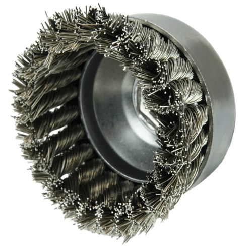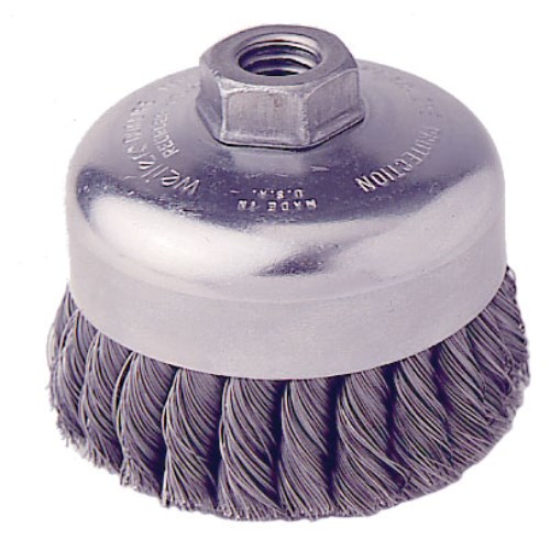 Weiler 4" Single Row Knot Wire Cup Brush provides heavy-duty brushing action with some flexibility for demanding cleaning applications on relatively flat surfaces. 5/8"-11 nut for use on right angle grinders.