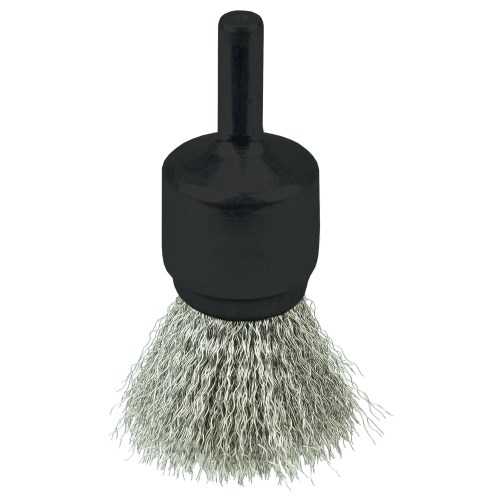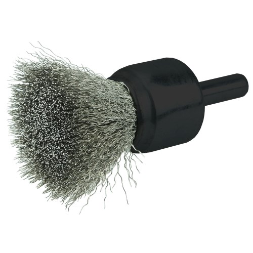 Weiler 3/4" Crimped Wire End Brush features a solid end construction and very flexible brushing action. Ideal for more demanding light duty cleaning applications in corners and hard-to-reach areas. 1/4" stem for use on die grinder and right angle air die grinder.