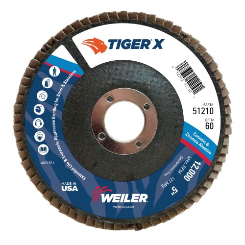 Weiler 5" Tiger X Flap Disc, Conical (TY29), Phenolic Backing, 60Z, 7/8" Arbor Hole 51210 (10 Pk)