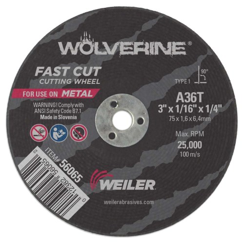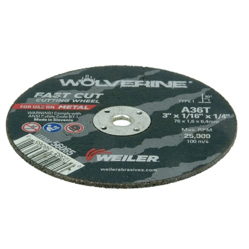 Weiler Wolverine 3 inch type 1 cutting wheels deliver a fast cut rate and consistent performance at a good value when cutting steel and other metals. The flat type 1 profile allows for deep cuts commonly required when cutting metal. The 1/16 inch wheel thickness is ideal for cutting tubes, bar stock, and large cross-sections with a die grinder. The 1/4 inch open arbor offers a cost-effective mounting option when using adapting nuts.