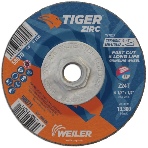 Weiler 4-1/2" x 1/4" TIGER ZIRC Type 27 Grinding Wheel, Z24T, 5/8"-11 Nut 58070 (10 Pk)