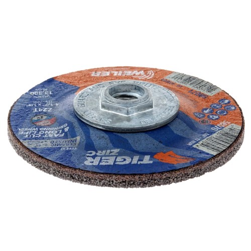 Tiger Zirc 4.5 inch type 27 depressed center grinding wheels cut faster and last longer so you get proven productivity at an exceptional total cost. The self-sharpening zirconia alumina grains retain a high cut rate throughout the life of the wheel while a hard bond delivers long wheel life for heavy duty applications. The flat profile of the wheel in combination with depressed center allows for a wide range of grinding angles (0-45). These 1/4 inch grinding wheels are ideal for heavy stock removal, scale removal, weld removal, weld blending, edge beveling, and torch-cut softening with a right angle grinder. A smaller hub on 4.5 inch wheels keeps the wheel from gouging valuable parts as well as allowing for 30% more usable wheel area.