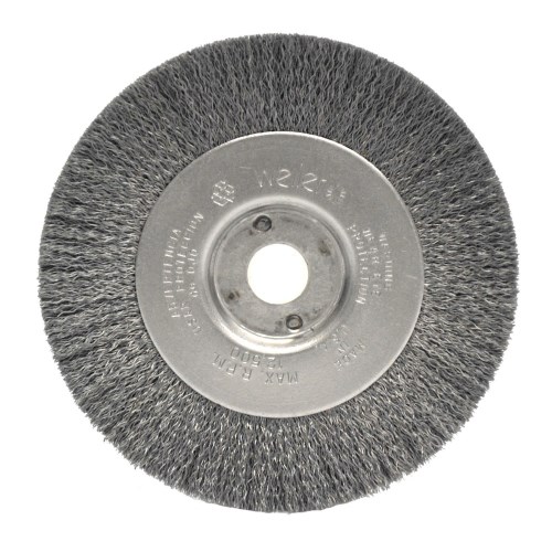 Weiler 4" Narrow Face Crimped Wire Wheel Brush provides a flexible brushing action and consistent performance for demanding light duty cleaning and deburring applications. Featuring Weiler's solid ring construction, these radial brushes are available in heat-treated steel, type 302 stainless steel and brass wire for use in a wide variety of applications. 1/2"-3/8" arbor hole for use on bench/pedestal grinder, CNC/milling/automatic machines and straight grinders.