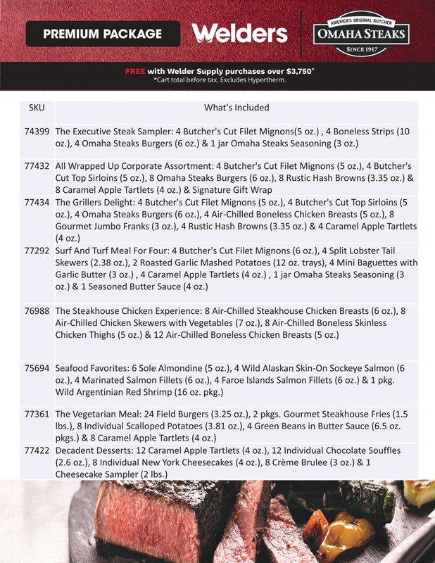 Take control of your hard-earned dollars with our Welding Steaks Madness Sale! Spend $3,750 or more on qualifying welding equipment and claim a Premium Level Omaha Steaks Gift Certificate.