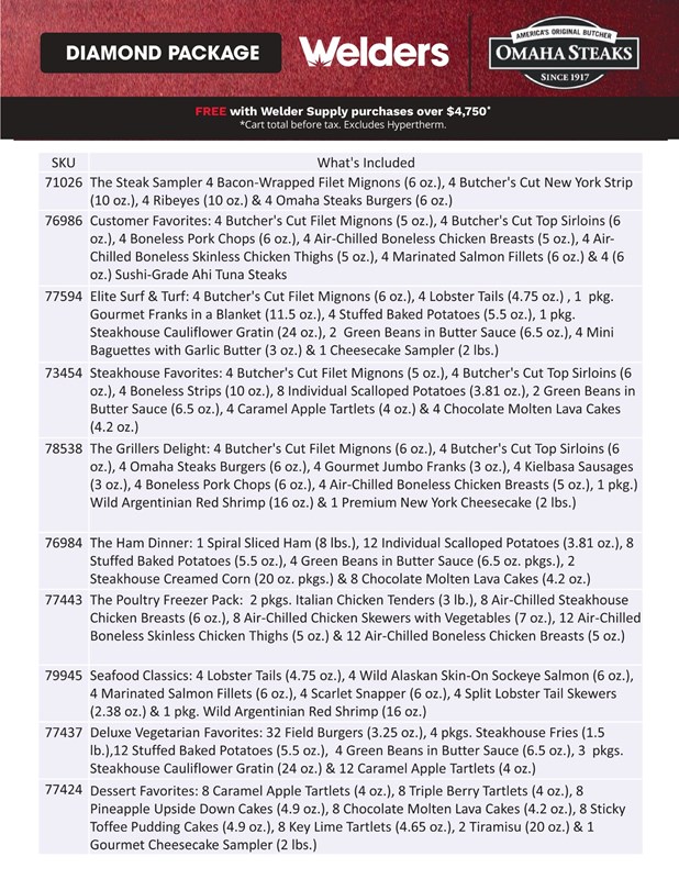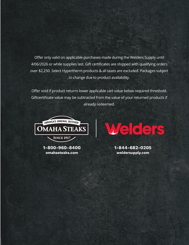 Take control of your hard-earned dollars with our Welding Steaks Madness Sale! Spend $4,750 or more on qualifying welding equipment and claim a Diamond Level Omaha Steaks Gift Certificate.